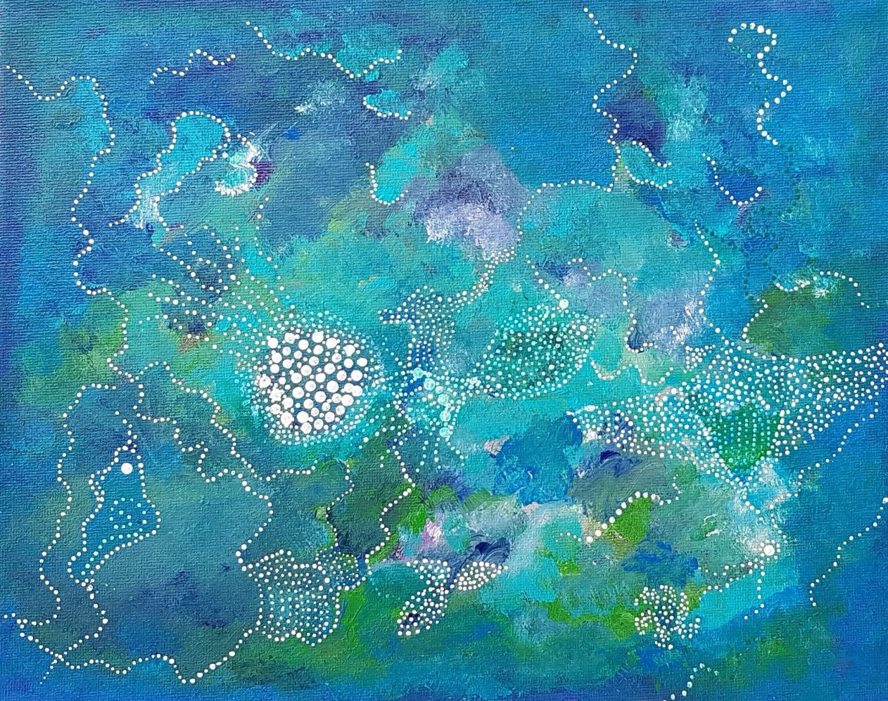 The main colours are blue and green in this "Underwater" piece. The basis consists of several layers of acrylic paint, using various techniques. Then, by following the lines and waves on canvas, the dreamy underwater landscape appeared almost by itself.