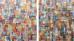 Acrylverf op 2 doeken waarin 2 kranten knipsels zijn verwerkt van de route van de Tour de France van 1999 verdeeld over de beide doeken.