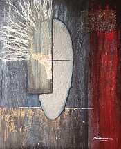 Acryl, Zand, rafia,ruw canvas en bladmetaal op doek. Geïnspireerd door de behoefte van de mens om vorm te geven aan dat waar we in willen geloven.