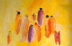 Geschilderd met acryl op linnen. Het linnen is eerst beplakt met krantenpapier en verder met schildersmes beschilderd.
